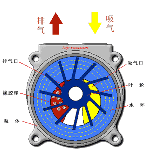 葉輪與泵殼成偏心,泵殼內(nèi)充一定量的水,葉輪旋轉(zhuǎn)使水形成水環(huán)。相鄰葉片(如圖中紅色葉片)旋轉(zhuǎn)時,與水環(huán)形成的空間(氣室)變大即進氣,空氣(氣室)逐漸變小,即空氣被壓縮。多組相鄰葉片,即多組往復(fù)壓縮。結(jié)構(gòu)緊湊、工作平衡可靠和流量均勻,所以化工生產(chǎn)中多用來輸送或抽吸易燃、易爆和有腐蝕性的氣體。水環(huán)式真空泵由于葉輪攪拌液體,損失能量大,故其效率很低。