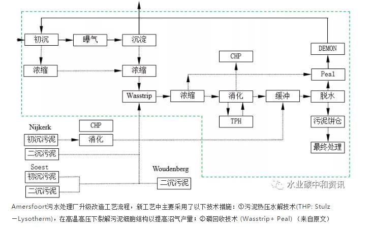 2015年建成12個能源工廠。在此方面,荷蘭已經取得一些積極成果,一些污水處理廠利用污泥厭氧消化產ch4,ch4熱電聯產(chp)發電/產熱反哺污水處理廠運行或供應社會。dokhaven 污水處理廠主流工藝采用ab法,a、b兩段剩余污泥以不同脫水方式脫水再進入后續消化池厭氧消化產ch4,并用于chp發電和產熱:電用于污水處理廠運行,余熱用于消化系統加熱和冬季辦公室取暖等。apeldoorn污水處理廠引入厭氧共消化技術同步處理剩余污泥和廚余垃圾,同時對污泥厭氧消化液采用側流自養脫氮(demon)工藝處理,以減少碳源消耗,增加更多剩余污泥量供厭氧消化轉化沼氣后用于chp發電。garmerwolde污水處理廠采用ab法中的a段將cod作為污泥(生物吸附)分離,并利用2個連續厭氧消化池處理這些污泥以及臨近的污水處理廠的剩余污泥。消化污泥脫水上清液采用節能型中溫亞硝化sharon工藝處理,沼氣chp發電可以滿足60%~70%的運行能耗,余熱則用于加熱消化池。阿姆斯特丹西區(amsterdamwest)污水處理廠目前是荷蘭最大的污水處理廠之一,該廠采用傳統污泥消化工藝。沼氣和消化后污泥送至附近垃圾焚燒廠使用和最終處置并生產能量。