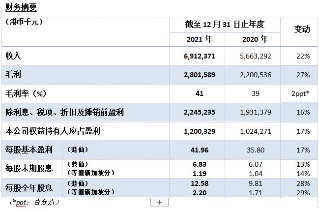二零二一財(cái)政年度,本集團(tuán)經(jīng)營(yíng)勢(shì)頭穩(wěn)健,錄得收入69.1億港元,較二零二零財(cái)政年度增長(zhǎng)22%;除利息、稅項(xiàng)、折舊及攤銷(xiāo)前盈利22.5億港元,較二零二零財(cái)政年度增長(zhǎng)16%;本公司權(quán)益持有人應(yīng)占盈利12.0億港元,較二零二零財(cái)政年度增長(zhǎng)17%;每股基本盈利41.96港仙,較二零二零財(cái)政年度增加6.16港仙,增幅17%;整體毛利率為41%,較二零二零財(cái)政年度上升2個(gè)百分點(diǎn)。本集團(tuán)融資渠道多元暢通,融資工具長(zhǎng)短期兼?zhèn)洌Y產(chǎn)質(zhì)優(yōu),資金充裕,負(fù)債合理,財(cái)務(wù)狀況健康。